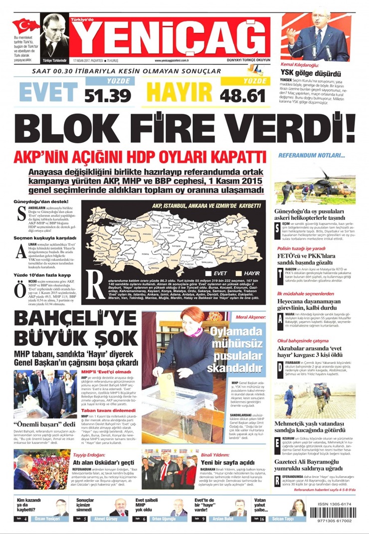 Partilerinin aksine referandumda ‘Hayır’ diyen MHP’lilerin çizgisindeki Yeniçağ, AKP, BBP ve MHP’nin 1 Kasım 2015’teki toplam oy sayılarına ulaşamadığını, iktidarın açığını HDP’nin kapattığını yazdı.