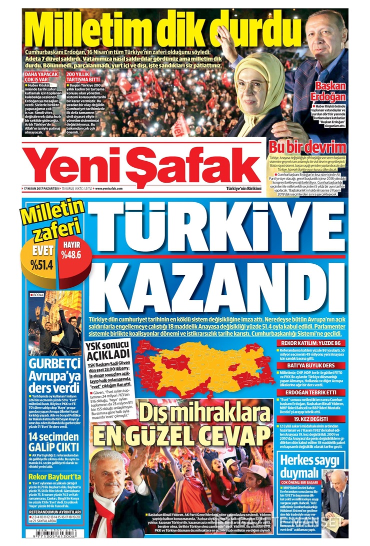 ‘Evet’ çıkmasıyla koalisyonların ve istikrarsızlığın ‘tarihe karıştığına’ vurgu yapan gazete, 18 maddeyi ‘neredeyse bütün Avrupa’nın açık saldırılarla engellemeye çalıştığını’ savundu. Sabah gibi Yeni Şafak’ta da YSK’nın tartışmalı kararı görmezden gelindi.