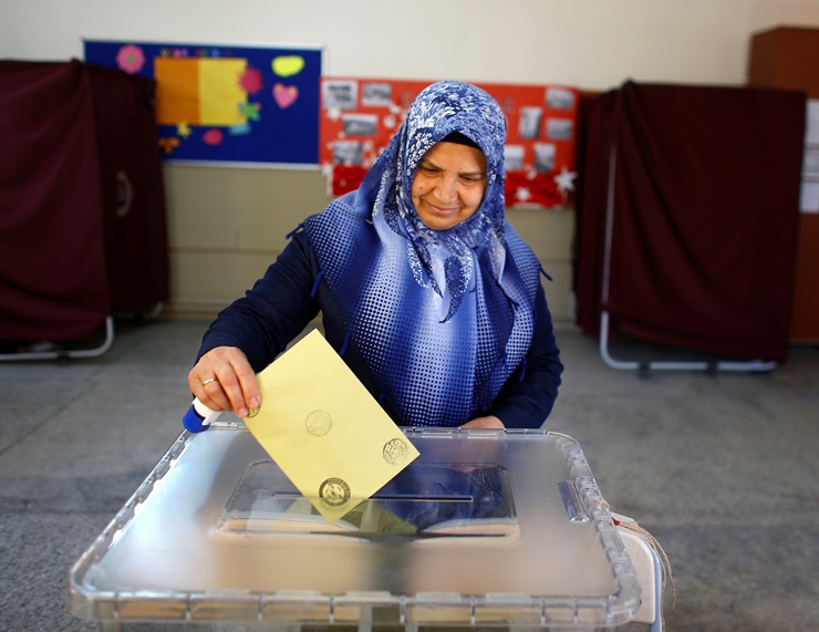 A woman casts her ballot at a polling station during a referendum in Ankara