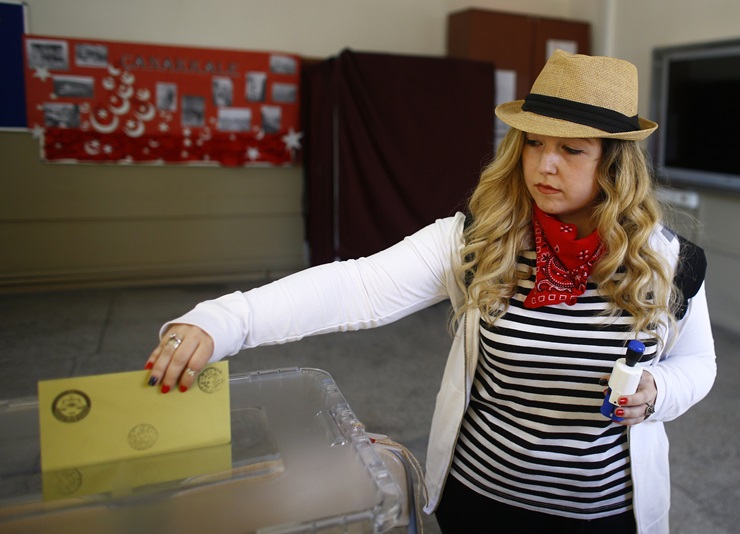 A woman casts her ballot at a polling station during a referendum Aegean port city of Izmir