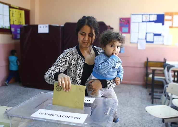 A woman holds a child as she casts her ballot at a polling station during a referendum Aegean port city of Izmir
