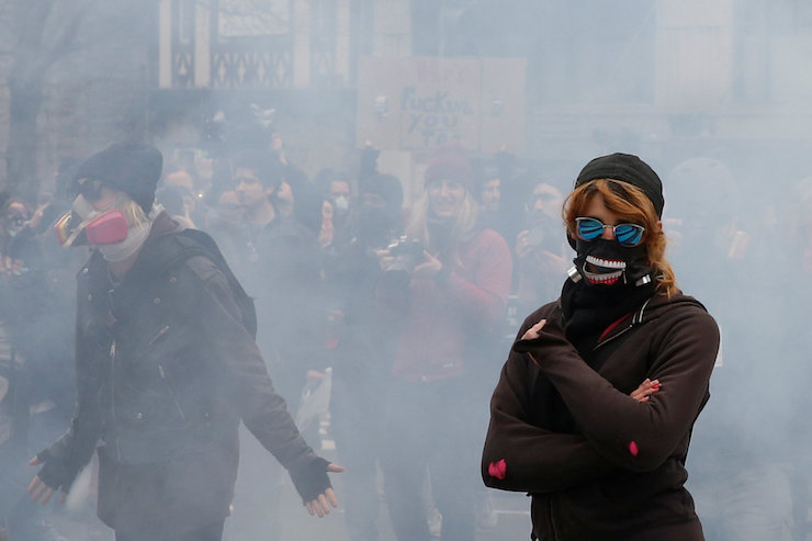 Activists stand amid smoke from stun grenade during protest against Trump on sidelines of inauguration in Washington, D.C.