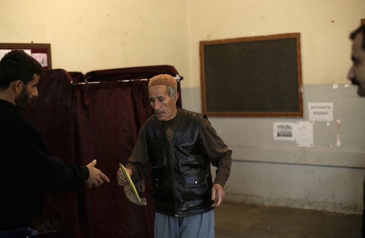 Man leaves a polling booth as he casts his vote at a polling station in Diyarbakir
