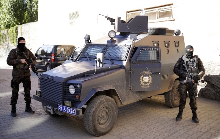 Turkish special police personnel stand guard outside a polling station in Diyarbakir