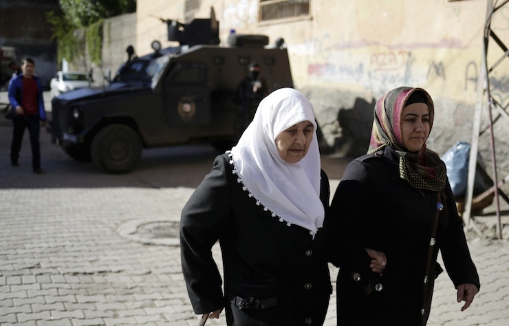 Women arrive to vote at a polling station as they walk past a Turkish special police in Diyarbakir