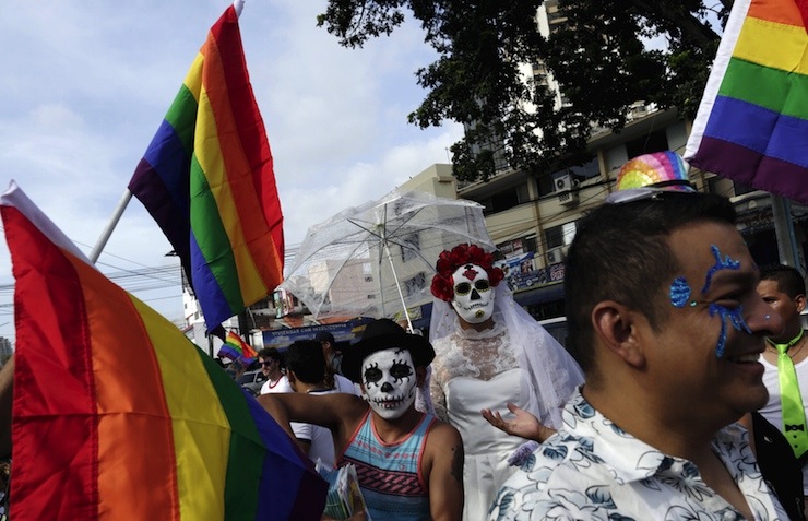 Revelers with skull masks are seen as they take part in a Gay Pride parade in Panama City