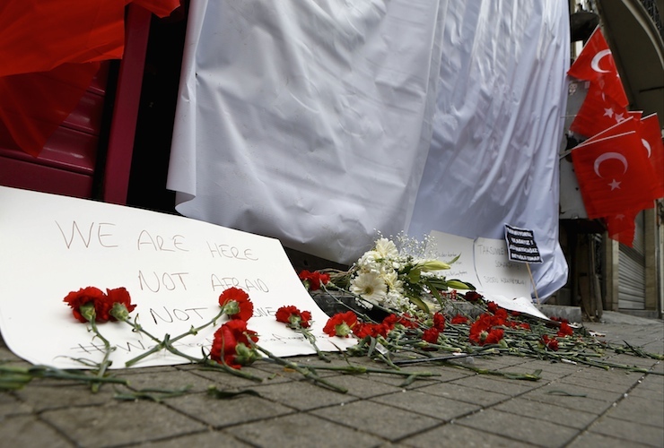 Carnations and a sign are placed at the scene of a suicide bombing at Istiklal street, a major shopping and tourist district, in central Istanbul