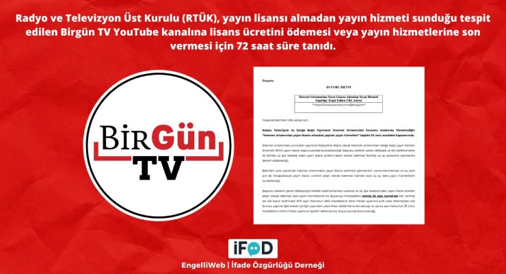 Radyo ve Televizyon Üst Kurulu’nun (RTÜK), BirGün TV YouTube kanalına lisans ücretini ödemesi ya da yayınlarını sonlandırması için tanıdığı 72 saatlik süre başladı.