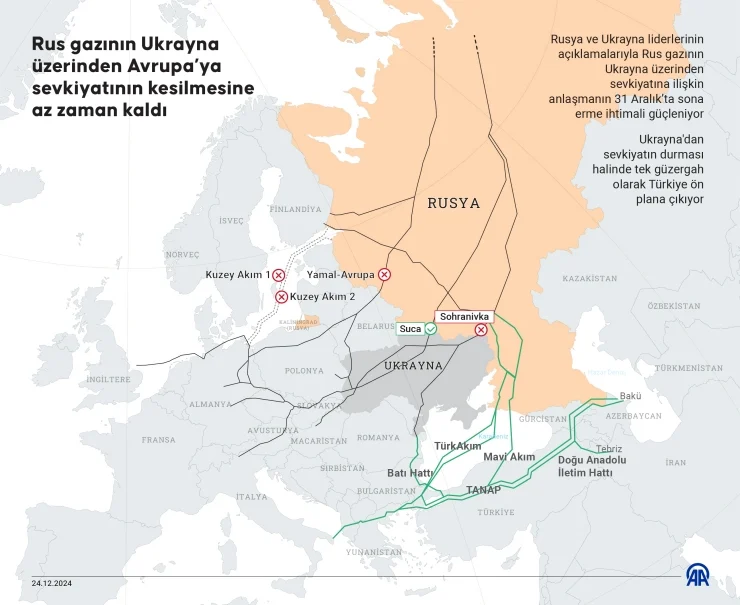 Rus gazını Avrupa’ya taşıyan ana boru hatları Kuzey Akım 1 ve Kuzey Akım 2 hatların gaz akışı sabotaj (saldırı) nedeniyle durdurulmuş, Yamal-Avrupa hattıysa Polonya sözleşmeyi uzatmadığı için atıl duruma düşmüştü.