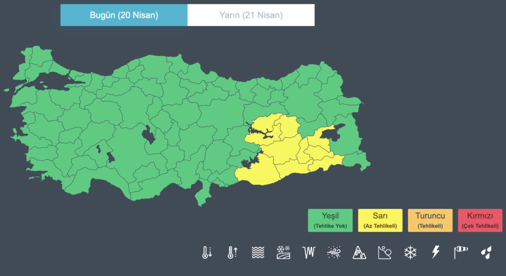 Sarı: Hava durumu potansiyel tehlikelidir. Tahmin edilen meteorolojik hadise olağandışı olmamakla birlikte, meteorolojik şartlardan etkilenebilecek faaliyetler konusunda dikkatli olunmalı.