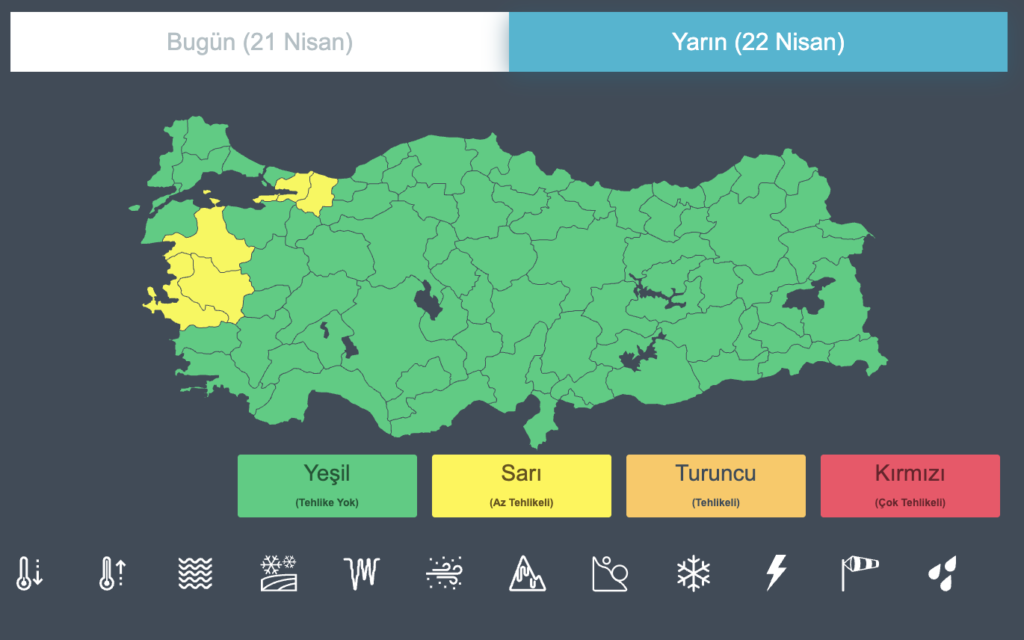 Sarı: Hava durumu potansiyel tehlikelidir. Tahmin edilen meteorolojik hadise olağandışı olmamakla birlikte, meteorolojik şartlardan etkilenebilecek faaliyetler konusunda dikkatli olunmalı.
