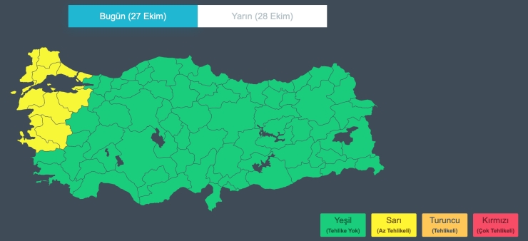 MGM’nin açıklamasına göre bugün (27 Ekim) öğle saatlerinden itibaren Trakya’da sağanak yağış bekleniyor.