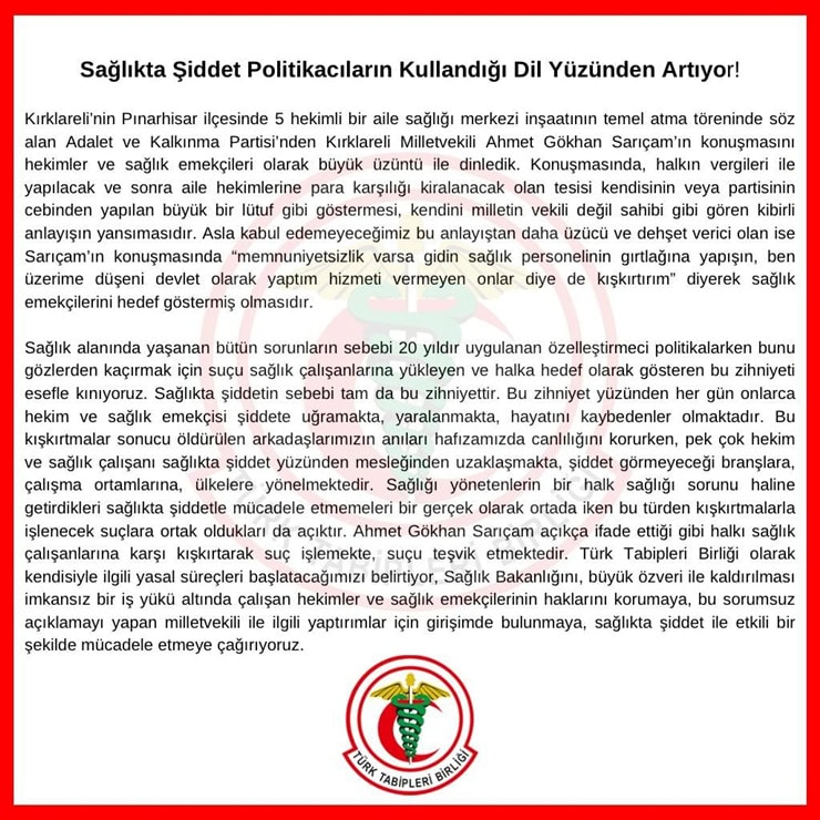 * Kırklareli’nin Pınarhisar ilçesinde beş hekimli bir aile sağlığı merkezi inşaatının temel atma töreninde söz alan Adalet ve Kalkınma Partisi’nden Kırklareli Milletvekili Ahmet Gökhan Sarıçam’ın konuşmasını hekimler ve sağlık emekçileri olarak büyük üzüntü ile dinledik.