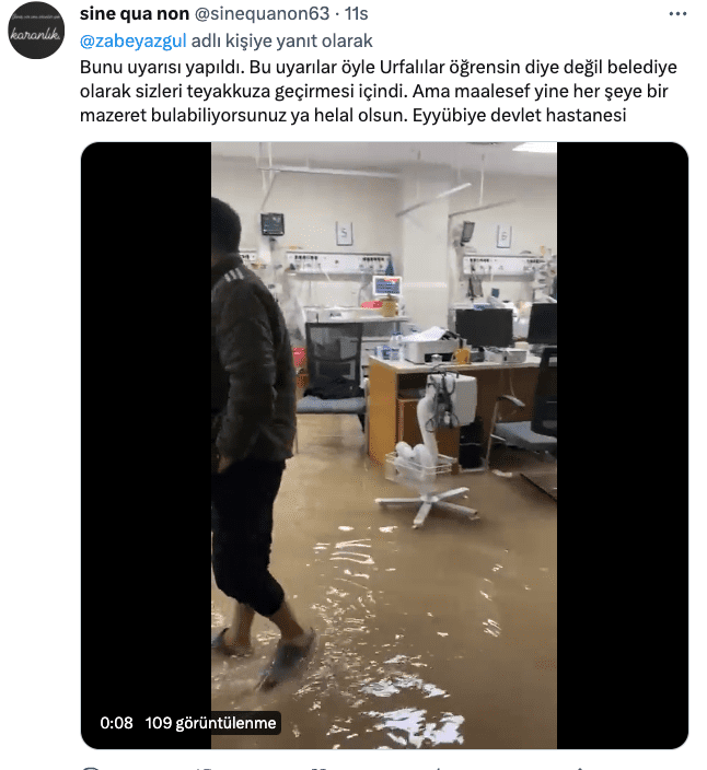 Şanlıurfa’da yağışlardan sonra Eyyübiye Eğitim ve Araştırma Hastanesi’ni su basmış; görüntülerde su bastığı sırada yoğun bakım ünitesinde yatan çocuklar görülmüştü.