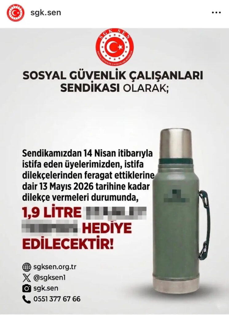 “Sendikamızdan 14 Nisan itibarıyla istifa eden üyelerimizden, istifa dilekçelerinden feragat ettiklerine dair 13 Mayıs 2026 tarihine kadar dilekçe vermeleri durumunda 1,9 litre termos hediye edilecektir.”