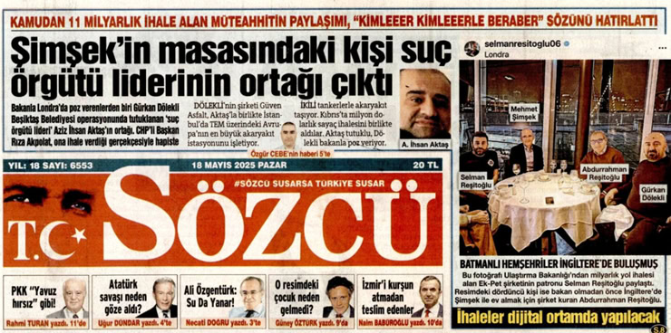 Sözcü gazetesi de bugünkü manşetinde söz konusu fotoğrafı ‘Şimşek’in masasındaki kişi suç örgütü liderinin ortağı çıktı’ başlığıyla haberleştirdi.