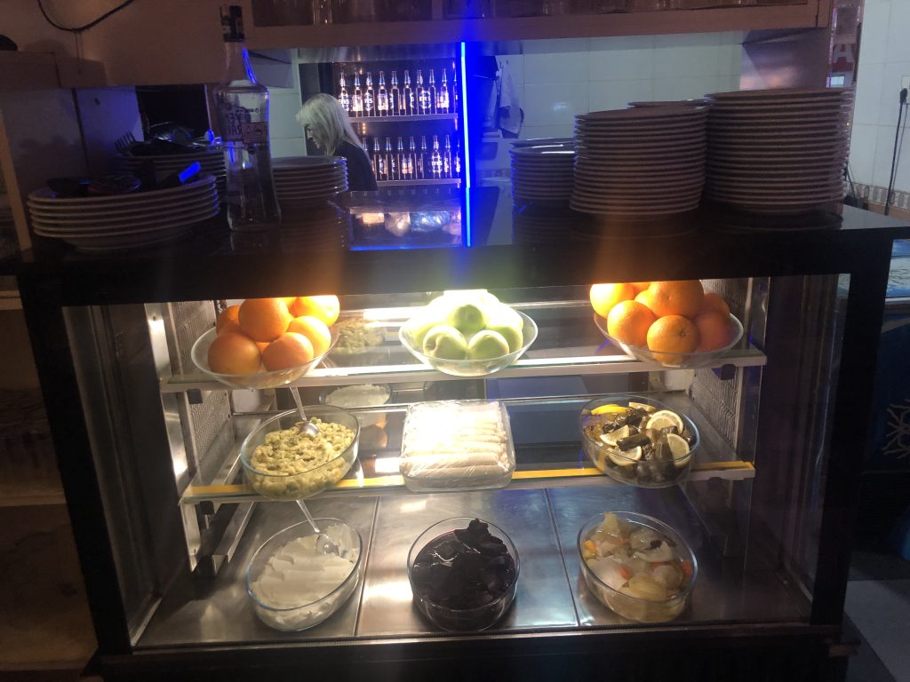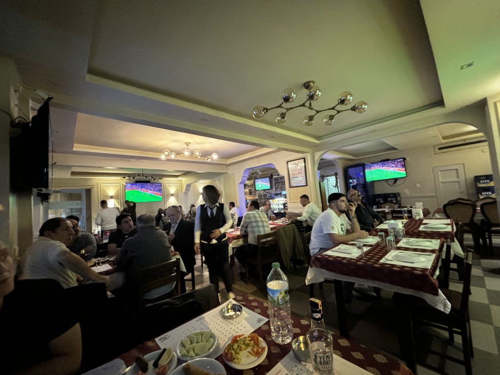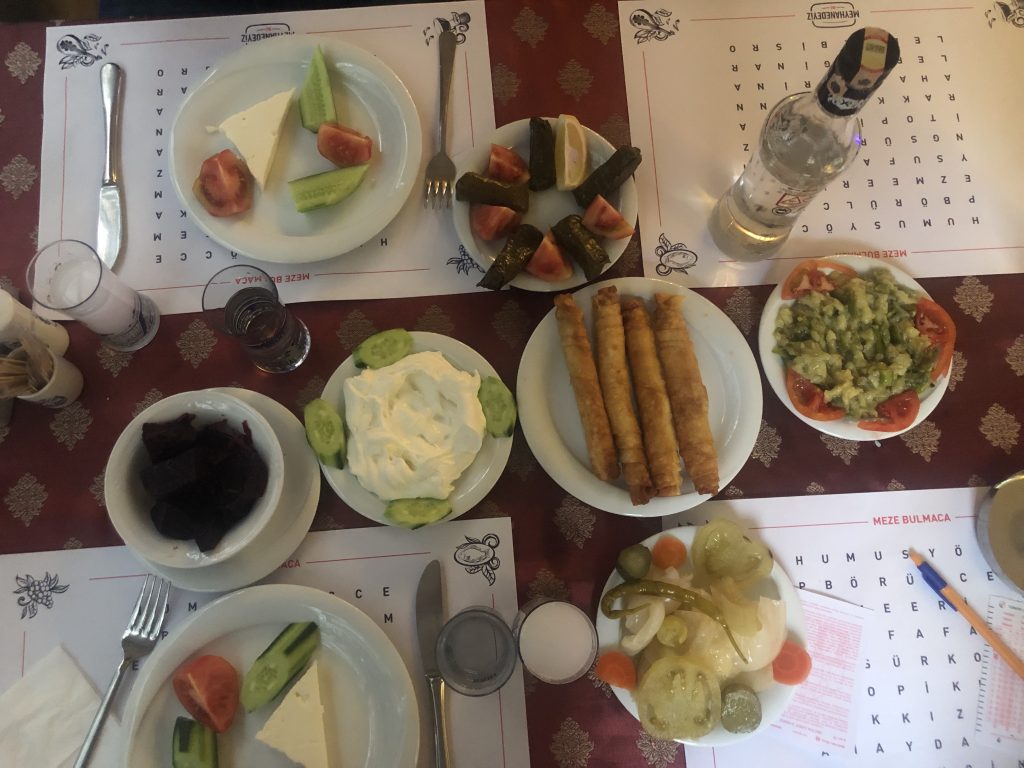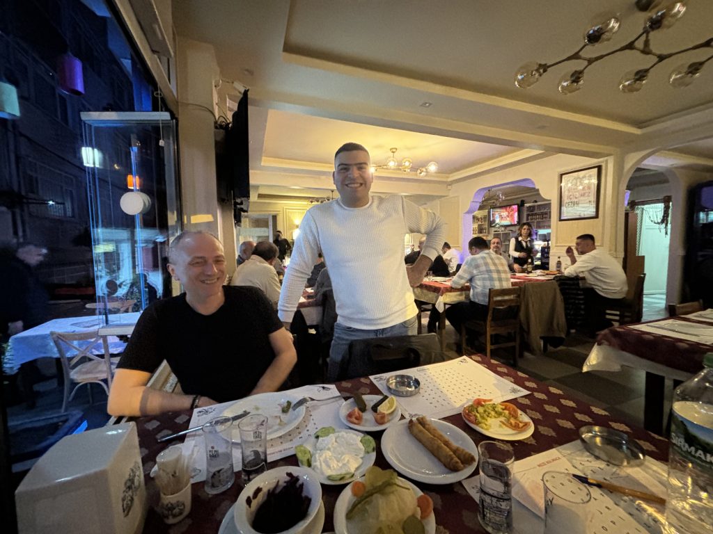 Mezeleri seçmek için dolabın başına geçtik ama zaten çeşit az. Normalde 20 mezeyi Ramazan nedeniyle üçe beşe düşürmüşler. O zaman ne varsa alalım: Beyaz peynir, acı biberli köz patlıcan, karışık turşu, yaprak dolma, süzme yoğurt, pancar turşusu, sigara böreği… Malzeme kalitesi iyi, hiç şikayetimiz yok. Zaten ne ben ne Murat müşkülpesent insanlarız.