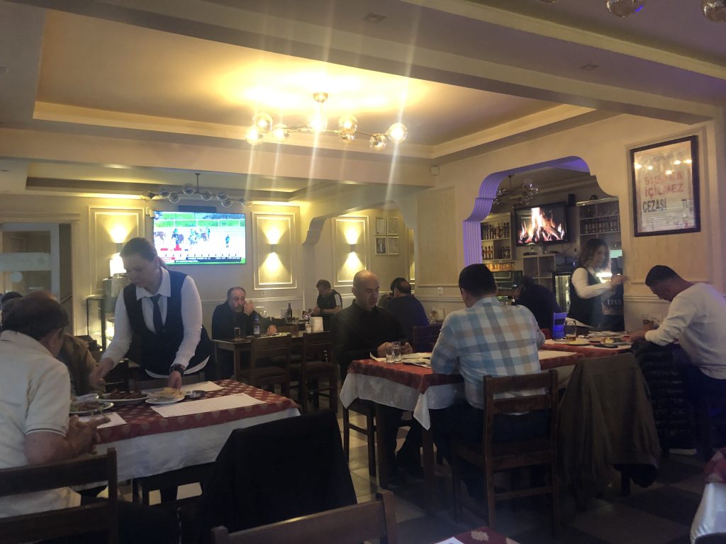 Siyah pantolon, yelek, beyaz gömlek giyen iki kadın garsondan bana servis yapan Melek, diğeri de Tanya. Bir de Yasin var, Suriye kökenli, tatlı şivesiyle tüm masalara yetişip kimisine muziplik yapıyor. Melek Hanım sekiz aydır burada imiş. Daha önce yakınlardaki bir türkü barda garsonmuş. Diğerleri gibi servisi güler yüzlü.