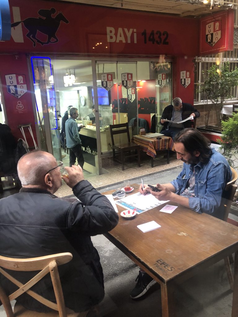 İçerideki 17 dörtlü masanın henüz birkaçı dolu. Müşterilerin çoğunun önünde at yarışı bültenleri, harıl harıl kupon dolduruyorlar. Dükkânın dört bir yanındaki toplam altı televizyon ekranının beşinde Adana hipodromundan canlı yayın var, birinde yanan şömine görüntüsü. Fonda da Baba Radyo.