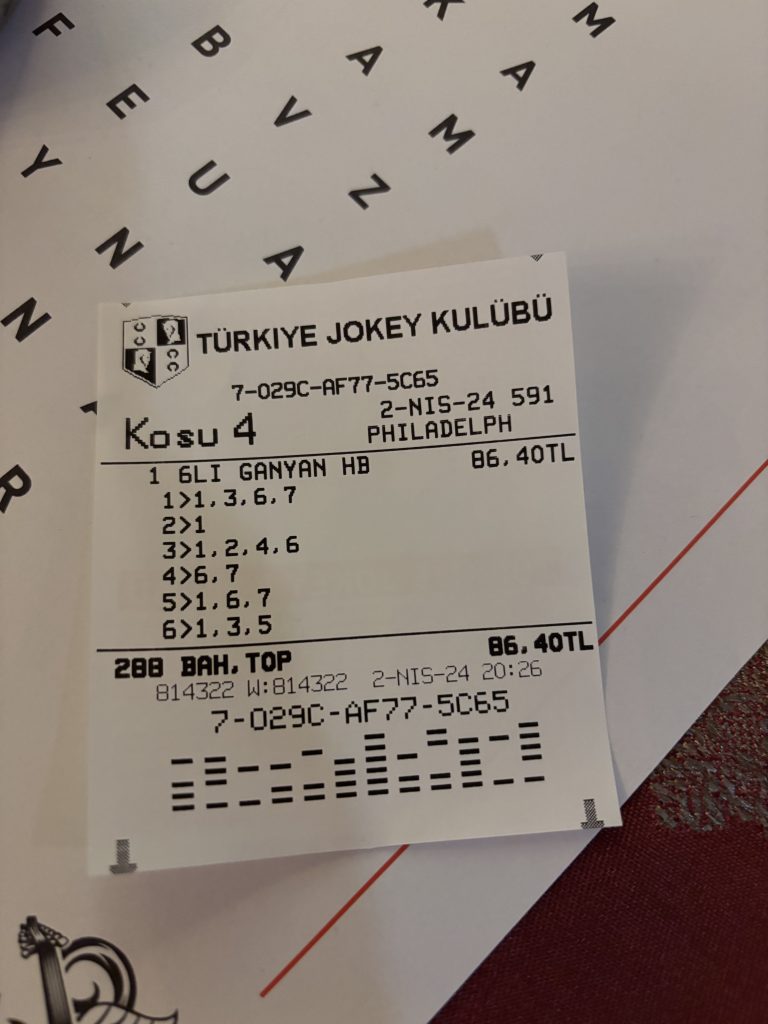 Yasin’e verdik parayı, gitti makineye oynattı, kuponu getirdi. O sırada ekranlarda Antalya yarışlarından canlı yayın var. Biz de sanıyoruz ki Antalya yarışlarına oynadık. Parayı Philadelphia’daki yarışlara yatırdığımızı, Antalya koşusu bittiğinde, kuponu gösterdiğimiz ganyancılardan öğrendik.