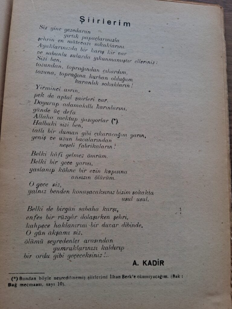 “Son çıkan aylık solcu mecmua, hem de tanınmış milliyetçi muharrirlerin bile seve seve bahsettiği bu mecmua, bu sayısında bir sınıfın açlık ve ıstırabını anlatan şiirlerle doldurmuş. Hayret ediyorum: Acaba Türkiye’de bir sınıf mücadelesinin olmadığını zannetmekle ben mi yanılıyorum?”