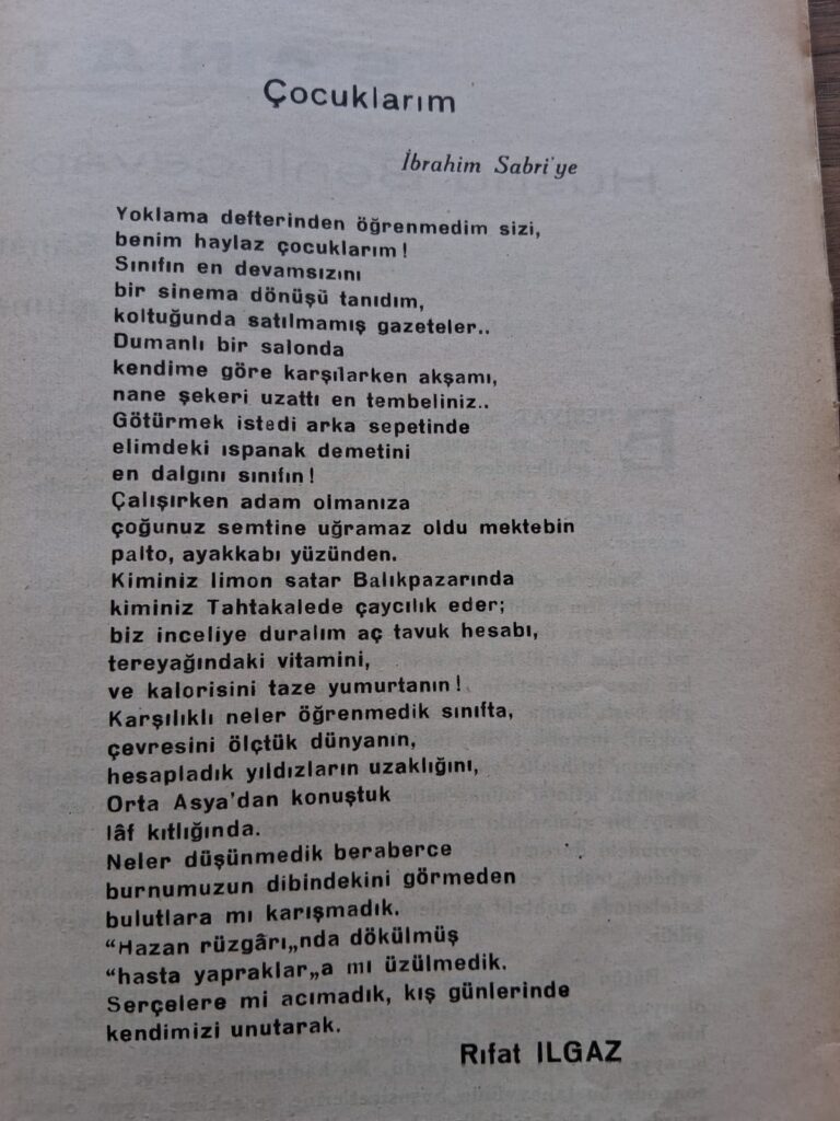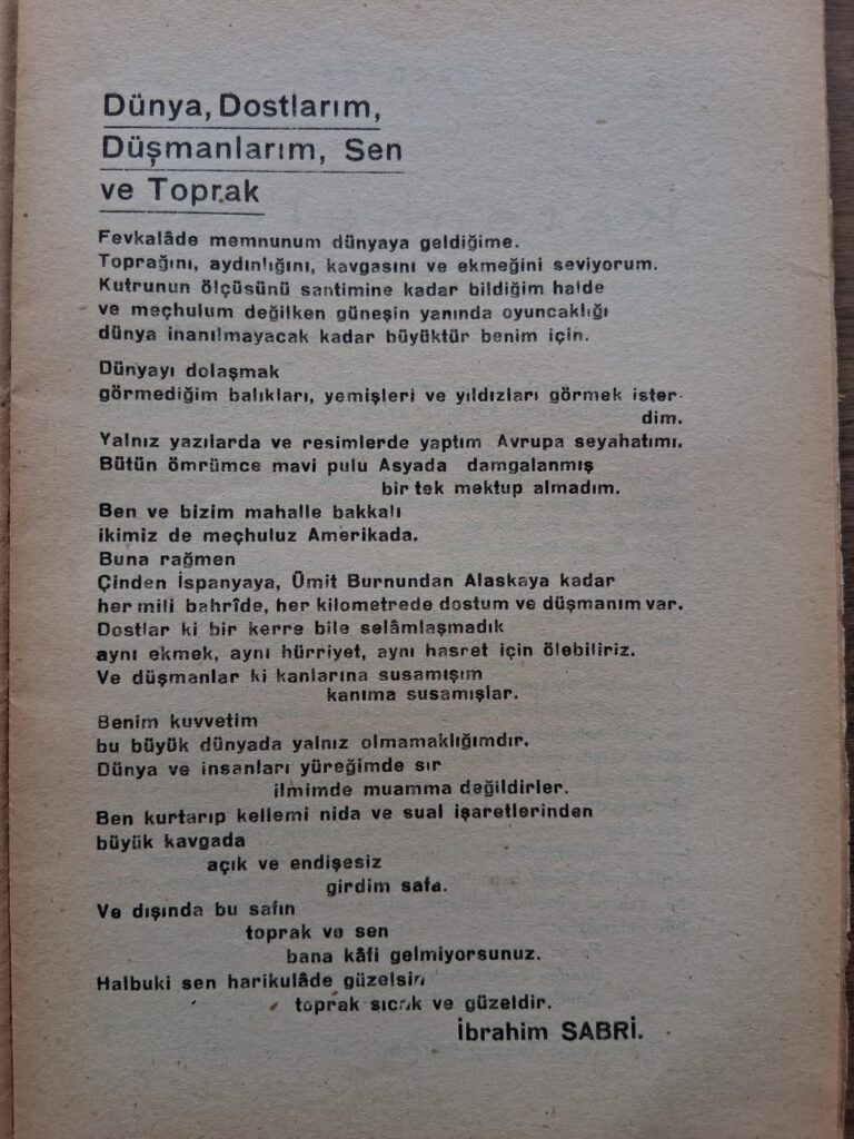Yukarıda adı geçen isimlerden biri, İbrahim Sabri, okura tanıdık gelmeyebilir. İbrahim Sabri’nin derginin 9. sayısında, 7. sayfada yer alan şiiri ‘Dünya, Dostlarım, Düşmanlarım, Sen ve Toprak’ başlığını taşır. 24 Mart 1943 tarihli 14. sayıda ise Rıfat Ilgaz, İbrahim Sabri’ye ithafen ‘Çocuklarım’ adlı şiirini yayımlar.