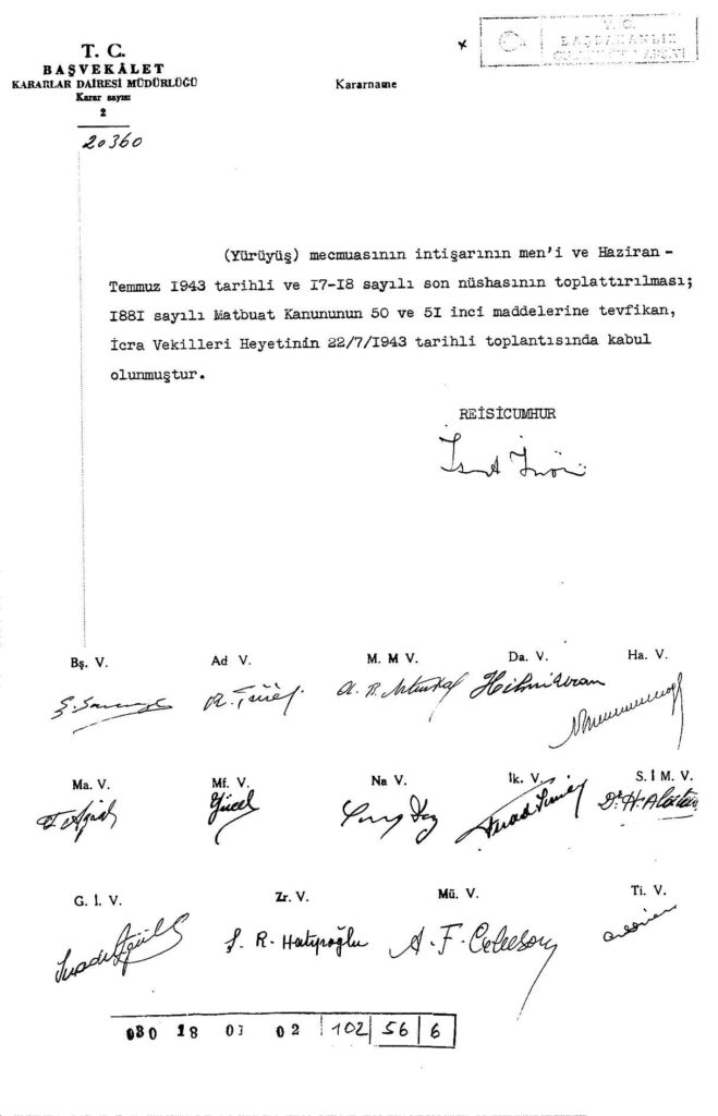 “(Yürüyüş) mecmuasının intişarının men’i, Haziran–Temmuz 1943 tarihli ve 17–18 sayılı son nüshasının toplattırılması; 1881 sayılı Matbuat Kanunu’nun 50 ve 51. maddelerine tevfikan, İcra Vekilleri Heyeti’nin 22/7/1943 tarihli toplantısında kabul olunmuştur.”