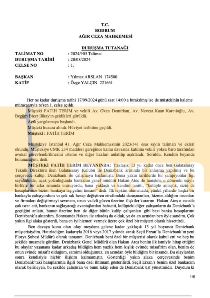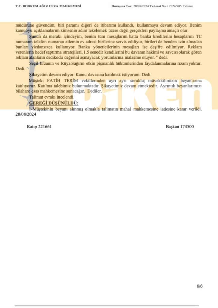 Davada adı geçen Terim Bodrum Ağır Ceza Mahkemesi’nde müşteki sıfatıyla bugün ifade verdi. Terim ifadesinde Seçil Erzanın ve Rüya Sağırın etkin pişmanlık hükümlerinden faydalanmalarına rızasının olmadığını dedi: “Şikayetim devam ediyor. Kamu davasına katılmak istiyorum.”