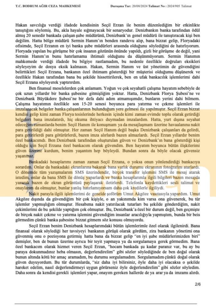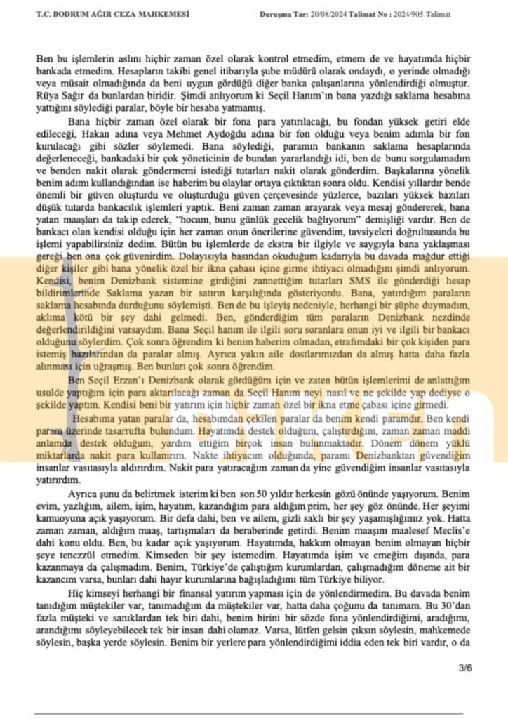 Ben finansal meselelerden çok anlamam. Yoğun ve çok seyahatli çalışma hayatım sebebiyle de çok uzun yıllardır bir banka şubesine gitmişliğim yoktur. Hatta, Denizbank Florya Şubesi’ne ve Denizbank Büyükdere Şubesi’ne bir defa dahi adım atmamışımdır, bunların yerini dahi bilmem. Çalışma hayatımın özellikle son 15-20 senesi boyunca para yatırma ve çekme işlemleri ile imzalanacak belgeler banka çalışanlarının bulunduğum yere gelmesi ile yapılmıştır. Seçil Erzan bizzat kendisi gelip kimi zaman Florya tesislerinde herkesin içinde kimi zaman evimde toplu olarak getirdiği belgeleri bana imzalatırdı, hiç okuma ihtiyacı duymadan imzalardım. Hatta, yurt dışına seyahat edeceğim zamanlarda benim Seçil Hanım ile konuşmam ya da mesajlaşmam üzerine havaalanına nakit para getirildiği dahi olmuştur. Her zaman Seçil Hanım değil başka Denizbank çalışanları da gelirdi, para getirirlerdi para götürürlerdi, bazen imza alırlardı bazen almazlardı. Seçil Erzan yıllardır benim özel bankacımdı. Ben Denizbank tarafından oluşturulan güven ve Denizbank’ın bana gösterdiği kişi olduğu için Seçil Erzana özel bankacım olarak güvendim. Ben hayatım boyunca bütün ilişkilerimi güven üzerine kurdum, benim yaşantım hep böyleydi. Bundan sonra da böyle olacak güvensiz yaşanmaz.