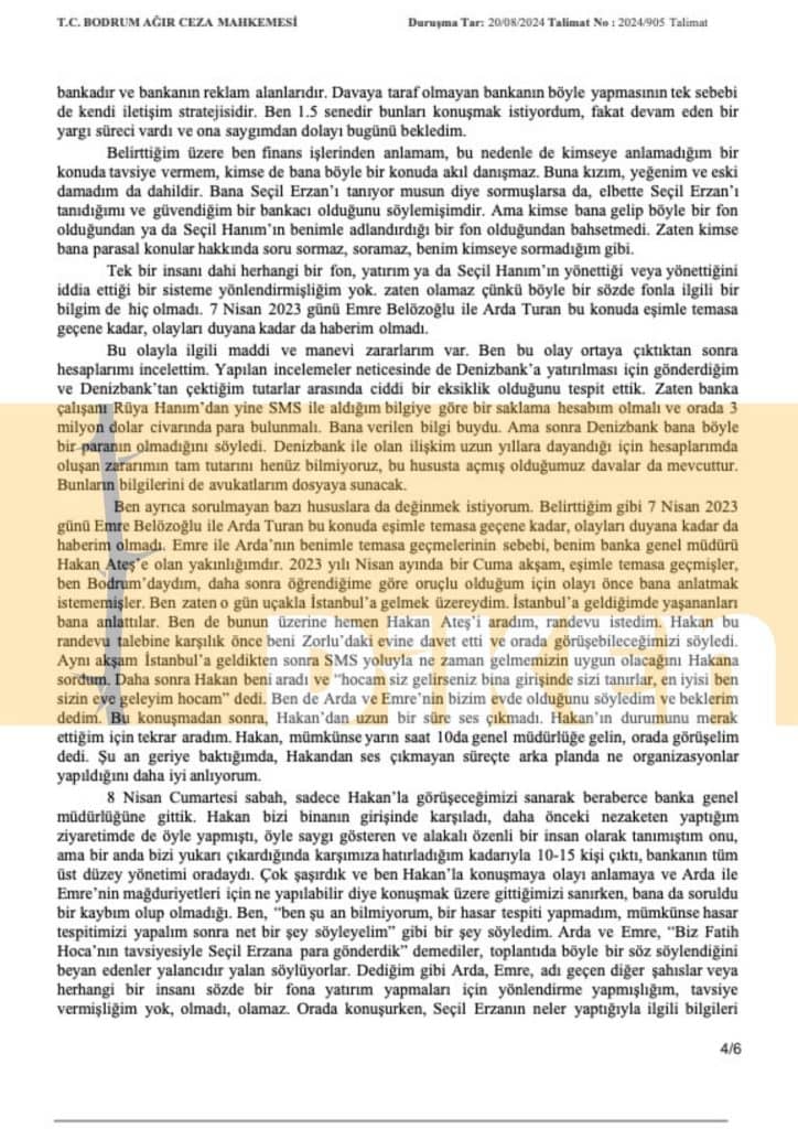 8 Nisan Cumartesi sabah, sadece Hakan’la görüşeceğimizi sanarak beraberce banka genel müdürlüğüne gittik. Hakan bizi binanın girişinde karşıladı, daha önceki nezaketen yaptığım ziyaretimde de öyle yapmıştı, öyle saygı gösteren ve alakalı özenli bir insan olarak tanımıştım onu, ama bir anda bizi yukarı çıkardığında karşımıza hatırladığım kadarıyla 10-15 kişi çıktı, bankanın tüm üst düzey yönetimi oradaydı. Çok şaşırdık ve ben Hakan’la konuşmaya olayı anlamaya ve Arda ile Emre’nin mağduriyetleri için ne yapılabilir diye konuşmak üzere gittiğimizi sanırken, bana da soruldu bir kaybım olup olmadığı. Ben, ‘Ben şu an bilmiyorum, bir hasar tespiti yapmadım, mümkünse hasar tespitimizi yapalım sonra net bir şey söyleyelim’ gibi bir şey söyledim. Arda ve Emre, ‘Biz Fatih Hoca’nın tavsiyesiyle Seçil Erzana para gönderdik’ demediler, toplantıda böyle bir söz söylendiğini beyan edenler yalancıdır yalan söylüyorlar. Dediğim gibi Arda, Emre, adı geçen diğer şahıslar veya herhangi bir insanı sözde bir fona yatırım yapmaları için yönlendirme yapmışlığım, tavsiye vermişliğim yok, olmadı, olamaz. Orada konuşurken, Seçil Erzanın neler yaptığıyla ilgili bilgileri duyunca şaşırdım, şaşırdığımı da belli etmişimdir.