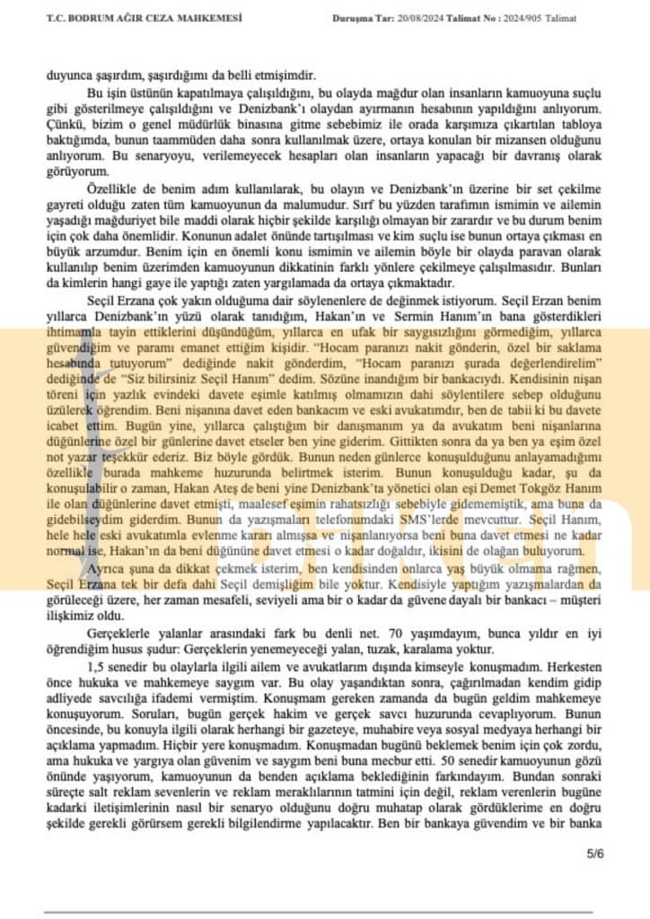 Ben davaya konu olan olay meydana gelene kadar yaklaşık 13 yıl boyunca Denizbank müşterisiydim. Hatırladığım kadarıyla 2016 veya 2017 yılında sanık Seçil Erzan’la Denizbank’ın yeni Florya Şubesi Müdürü olarak tanıştım. Denizbank beni özel bir müşterisi olarak kabul etti ve hep bu şekilde muamele gördüm. Denizbank Genel Müdürü olan Hakan Ateş benim ilk ismiyle hitap ettiğim bu olaylar yaşanana kadar arkadaş bildiğim hem yazlık hem kışlık evimde misafirim olan, benim de onun evinde misafir olduğum, samimi olduğumuz, en azından öyle bildiğim bir insandı. Bu olaylardan sonra kendisiyle hiçbir ilişkim kalmamıştır. Gösterdiği yakın alaka çerçevesinde benim Denizbank’taki hesaplarımla ilgili bana özel ihtimam gösterilirdi. Seçil Erzan’ı benim özel bankacım olarak belirleyen, bu şekilde çalıştıran ve bunu takip eden de Denizbank üst yönetimidir.