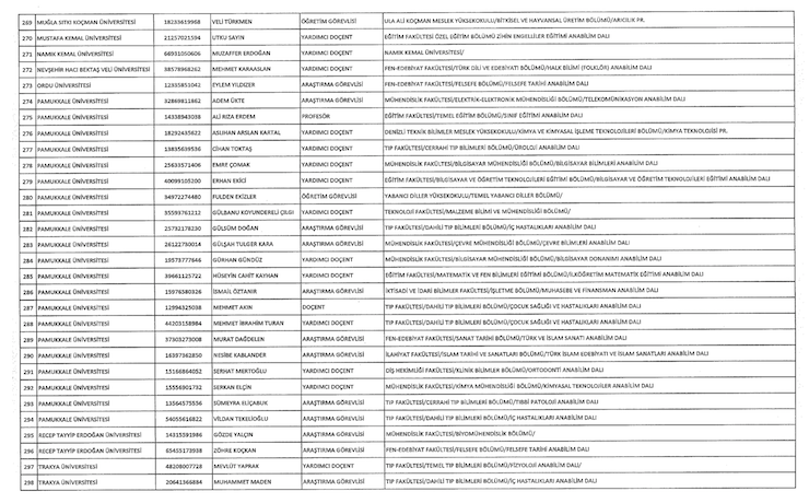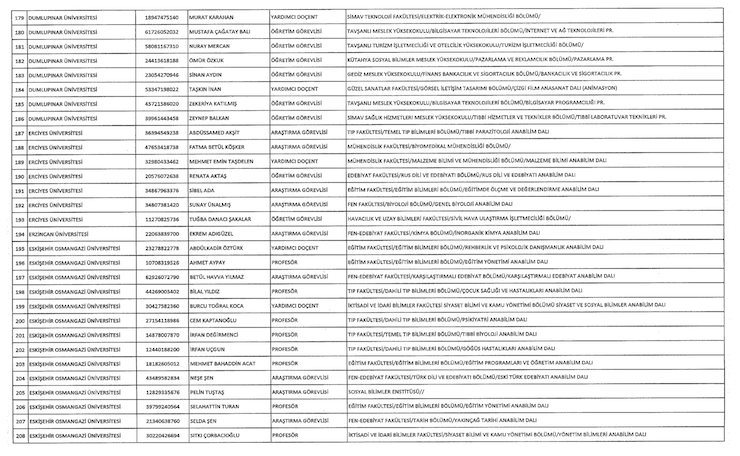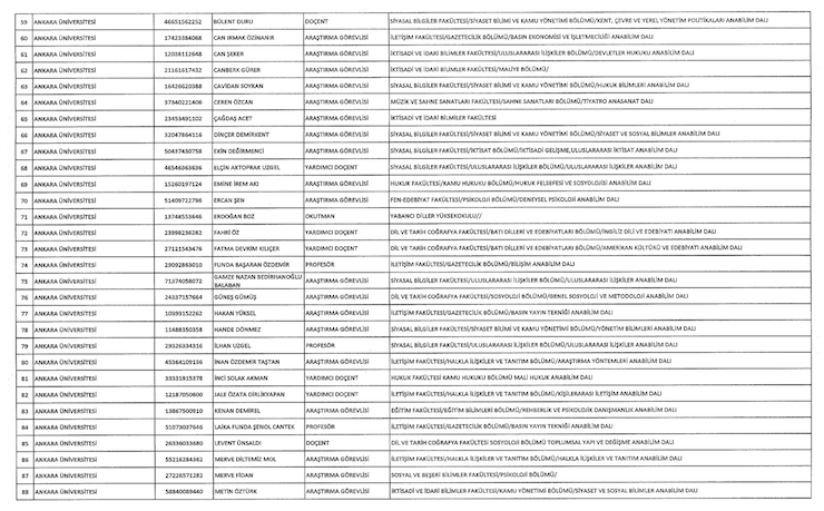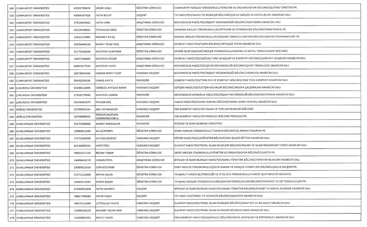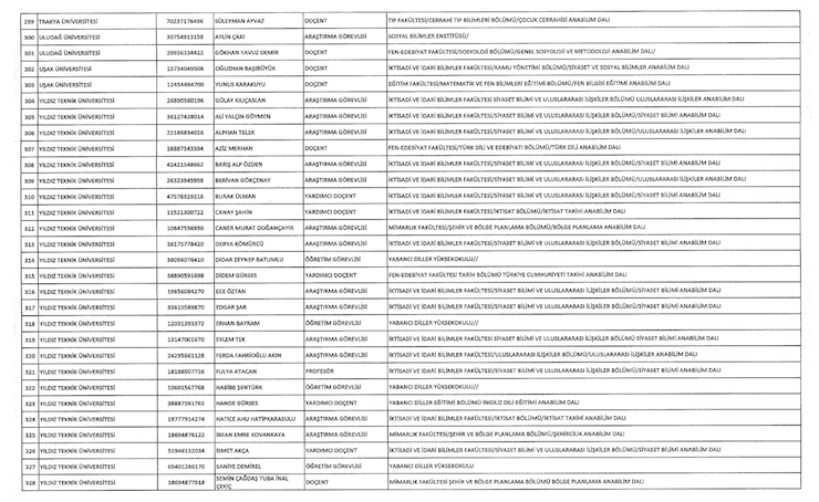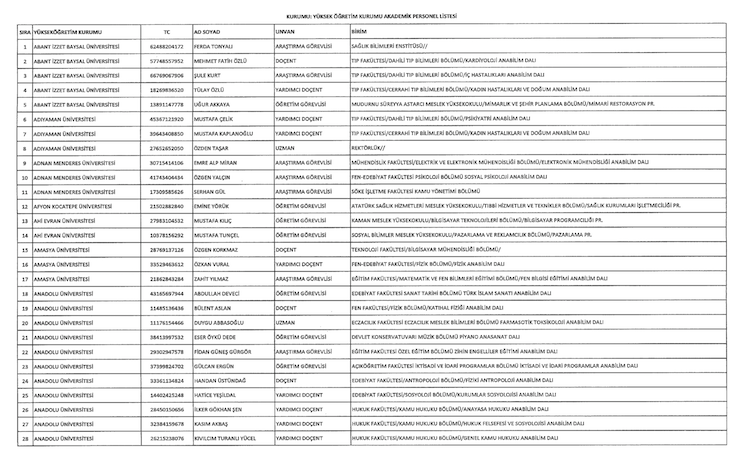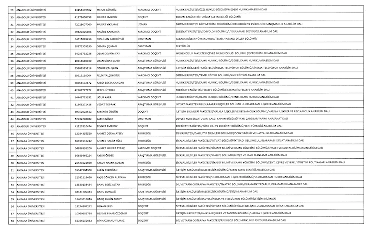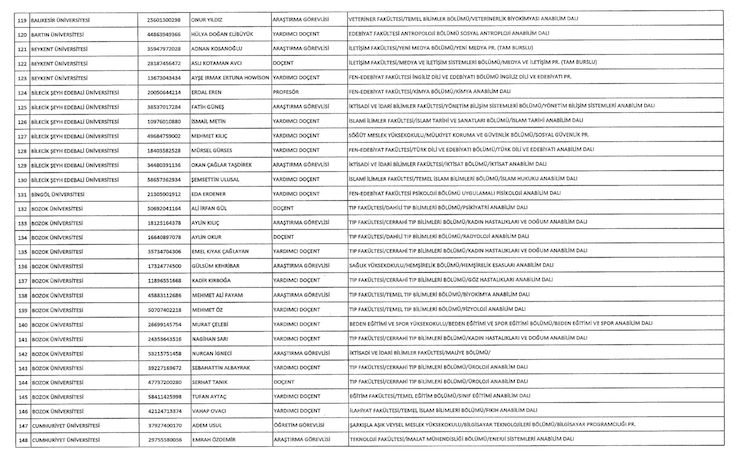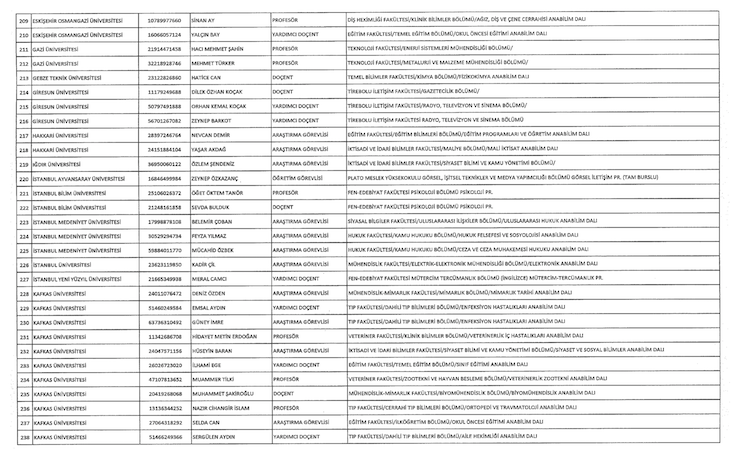 Liste şöyle; Adnan Menderes Üniversitesi (iki), Anadolu Üniversitesi (18), Ankara Üniversitesi (34) Atatürk Üniversitesi (bir), Balıkesir Üniversitesi (bir), Bartın Üniversitesi (bir), Beykent (bir), Bingöl Üniversitesi (bir), Çukurova Üniversitesi (iki), Doğuş Üniversitesi (iki), Dumlupınar Üniversitesi (bir), Eskişehir Osmangazi Üniversitesi (bir), Giresin Üniversitesi (iki), Iğdır Üniversitesi (bir), Ayvansaray Üniversitesi (bir), Bilim Üniversitesi (iki), Yeni Yüzyıl Üniversitesi (bir), Kırıkkale Üniversitesi (bir), Marmara Üniversitesi (22), Recep Tayyip Erdoğan Üniversitesi (bir), Trakya Üniversitesi (bir), Uludağ Üniversitesi (iki), Yıldız Teknik Üniversitesi (15).