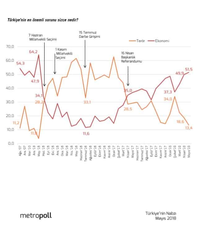 Mayıs ayında yapılan çalışmaya göre “Türkiye’nin en önemli sorunu sizce nedir” sorusuna halkın yüzde 51.5’i “Ekonomi” dedi.