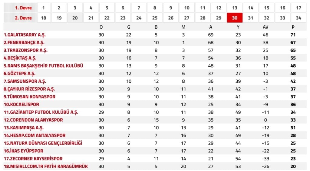 Trendyol Süper Lig’in 30’uncu haftası, Gaziantep FK’nın Kayserispor’u 3-0 yendiği maçla tamamlandı.
