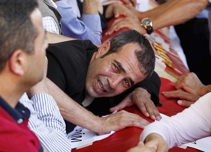 Relatives of victims who were killed in Monday's bomb attack in Suruc mourn over the coffins at a cemetery in Gaziantep