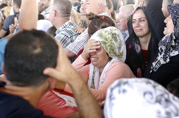 Relatives of victims who were killed in Monday's bomb attack in Suruc mourn over the coffins at a cemetery in Gaziantep