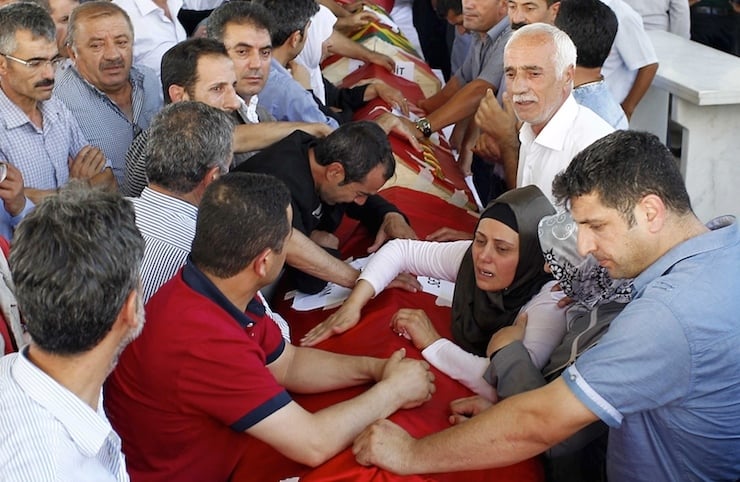 Relatives of victims who were killed in Monday's bomb attack in Suruc mourn over the coffins at a cemetery in Gaziantep