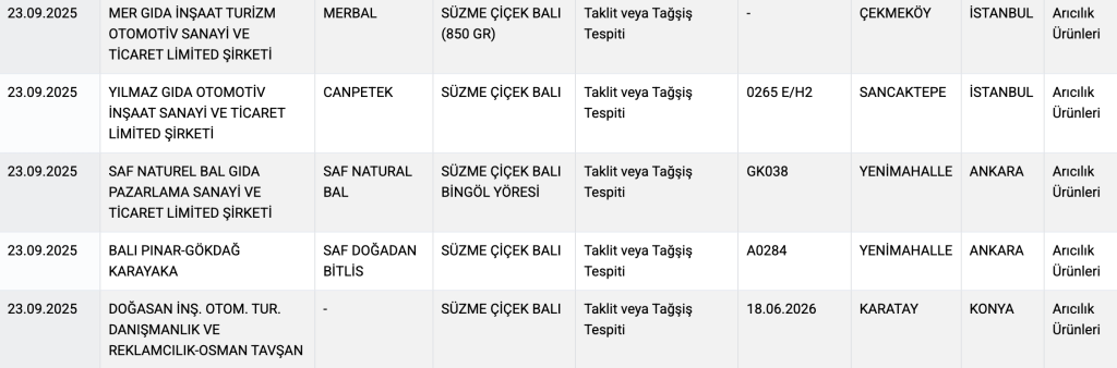 Buna göre 23 Eylül 2025’te duyurduğu ‘Taklit veya Tağşiş Yapılan Gıdalar’ listesine eklenen ballar şunlar: