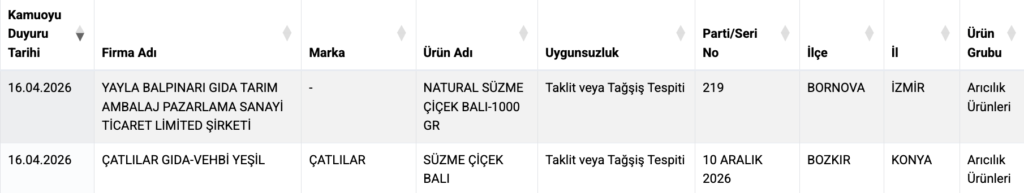 Buna göre 16 Nisan 2026’da ‘Taklit veya Tağşiş Yapılan Gıdalar’ listesine eklenen bal markaları şunlar: