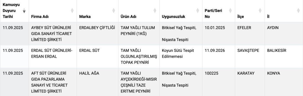 Ayrıca aşağıdaki peynirler de 11 Eylül tarihli listeye eklendi.