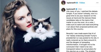 ABD’nin popüler kültür ikonlarından şarkıcı Taylor Swift, başkanlık münazarasının hemen ardından Kamala Harris’i desteklediğini açıkladı: ”Oyum Harris’e çünkü o haklar ve davalar için mücadele ediyor ve bu davaları savunacak bir savaşçıya ihtiyaç var.”