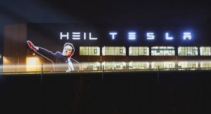 Berlin yakınlarındaki Tesla fabrikasının dış yüzeyine Musk’ı bir kolu havada gösteren fotoğraf ve Nazi döneminin sembollerinden ‘Heil Tesla’ (Yaşasın Tesla) yazısı yansıtıldı.