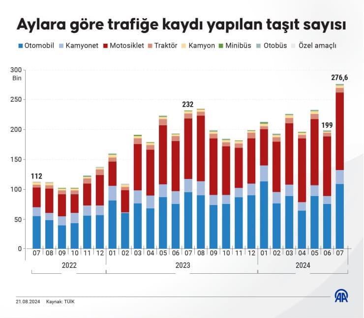 Türkiye İstatistik Kurumu (TÜİK) motorlu kara taşıtları istatistiklerine göre temmuzda trafiğe kaydedilen taşıt sayısı geçen yılın aynı ayına göre yüzde 19,1 artışla 276 bin 615’e çıktı.