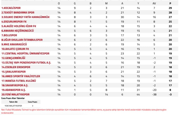Kocaelispor’un zirvede yer aldığı ligdeki puan durumu şöyle: