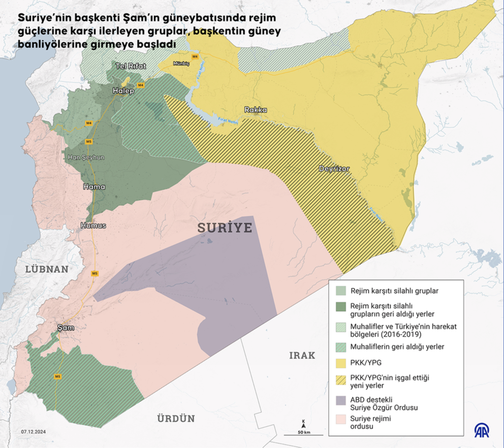 Suriye birlikleri gün içinde güneydeki iki büyük şehir Süveyda ve Dara’dan da çekildi. Dolayısıyla Şam hem kuzey hem güneyden HTŞ öncülüğündeki rejim karşıtlarının tehdidiyle karşı karşıya.