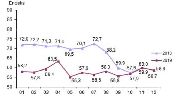 Türkiye İstatistik Kurumu (TÜİK) ve Merkez Bankası (MB) işbirliği ile yürütülen tüketici eğilim anketi sonuçlarından hesaplanan mevsim etkilerinden arındırılmış tüketici güven endeksi, aralık ayında bir önceki aya göre yüzde 1.9 oranında azaldı. Kasım ayında 59.9 olan endeks, aralık ayında 58.8 oldu.