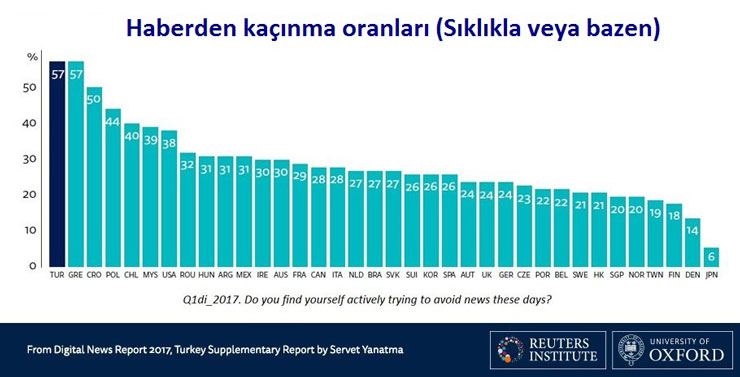 Oxford Üniversitesi Reuters Gazetecilik Çalışmaları Enstitüsü’nün beş kıtada 36 ülkede yaptığı araştırmaya göre Türkiye ‘haberden kaçınma’ listesinin en başında. Türkiye’de insanlar çeşitli sebeple haberlerden uzak durmayı tercih ederken en güçlü faktör ‘ruh hallerinin olumsuz etkilenmesi.’