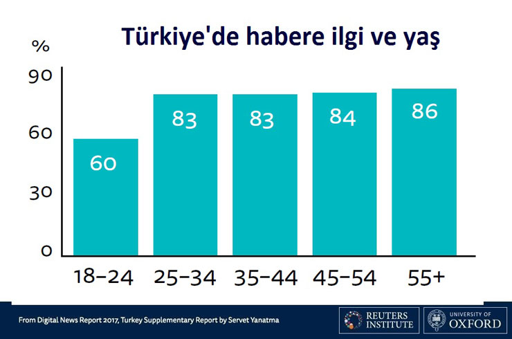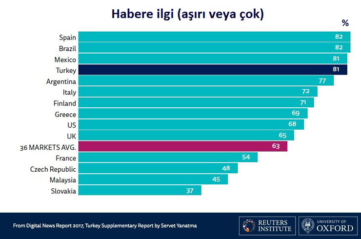 Türkiye’de habere ilgi çok güçlü. Habere ilginin ‘aşırı veya çok’ olduğu ülkelerin başında yüzde 82 ile İspanya ve Brezilya geliyor. Bunları ise yüzde 81 ile Türkiye ve Meksika takip ediyor. Bu oran Britanya’ra yüzde 65 ve Fransa’da yüzde 54.