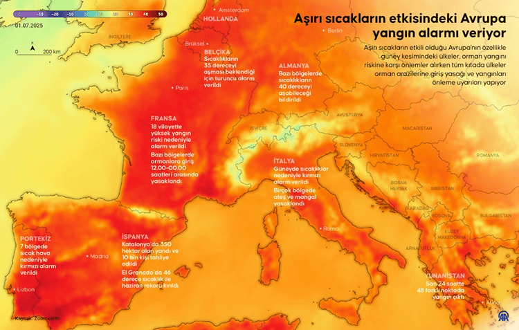 Ormanlara giriş yasağı, ateş ve mangal yasağı gibi uygulamaları yürürlüğe koyan Avrupa ülkelerinde yetkili kurumlar, yangın riski bulunan bölgelerde yüksek seviyeli alarm vererek olası yangınlara müdahale hazırlığı yapıyor.