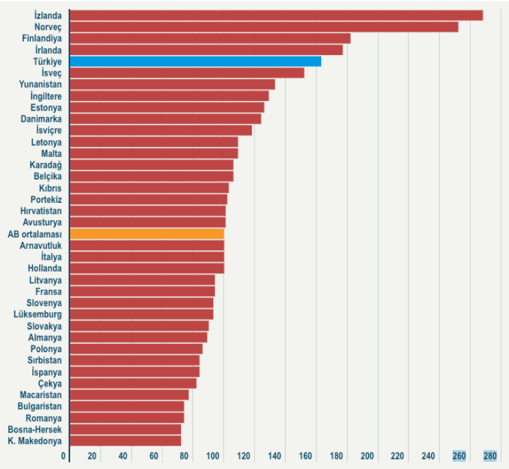 Eurostat’ın açıkladığı SGP’ye göre kişi başına gayri safi yurt içi hasıla (GSYH) endeksi 2018 yılı geçici sonuçları bağlamında bakıldığında, 28 AB ülkesi ortalaması 100 iken, Türkiye’nin ortalaması 65.